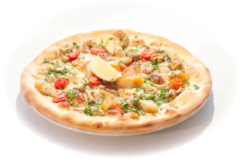 mozzarella Fiore di Latte, oliwa extra vergine, mix owoców morza, czosnek, pomidor koktajlowy, natka pietruszkiFior di Latte mozzarella, extra virgin olive oil, seafood mix, garlic, cherry tomato, parsley