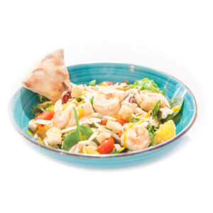 fried shrimps (5 pcs.) on lettuce, with orange, mozzarella, almond flakes, croutons and chilli-mango sauce